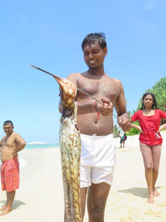 Madiha se trouve seulement à quelques kilomètres au sud de la ville de Matara. Loin de l’agitation balnéaire classique, nous avons l’impression de découvrir un petit bout de vie locale. Sur la plage, des familles entières se baignent, les femmes toutes habillées, les hommes en short et les enfants en maillot de bain. Il règne une atmosphère de joie, les femmes rient, les enfants s’éclaboussent, les hommes crawlent. Tout le monde est heureux, et personne ne se pavane. Personnellement, ça fait du bien… c’est une vraie respiration.